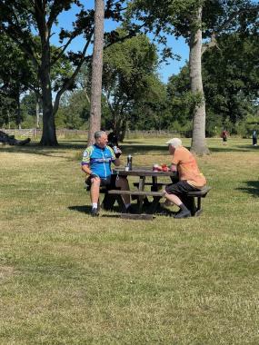 We got to the cafe at 10:45, luckily missing the queues. We fed and watered ourselves in the glorious sunshine. Leigh and David Smith were planning world domination - see picture! We wanted a quick turn around for drinks back at Allenbury’s, so we were away by 11:15.