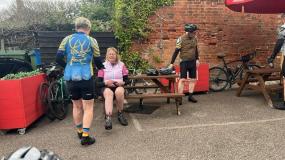 Having climbed more than 2,500 feet already and tummies overfilled we set off back. Next stop was only another 17 miles away in Great Waltham. We sped along up lots of rolling hills. The temperature was dropping rapidly and arm warmers and gilets were back on. Carolyn was to phone Pete when we got to the next stop as he was to going to join us there. We got to the pub at a quarter to four, battered and bruised from all the hill climbing, where a pint of lemonade and lime went down well.