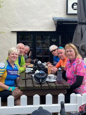 The usual banter was enjoyed and everyone was looking forward to the first stop at Blackmore. But, before that we had to climb the ladies UCI at 15 miles. It’s never easy and as usual I was in last place. We got to the top and usually have a breather. However, everyone else powered on. Playing catch up, I met up with everyone about 2 miles down the road. All was well and we rolled into Blackmore (see image) at a quarter to ten, 28 miles down and ready for a quick bite to eat.